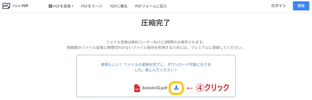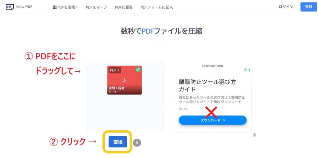 ダウンロードやメール登録が必要だったり、変換回数が制限されていたりするものが多い中、こちらはすぐに圧縮してくれますよ。変換ボタンがわかりやすいので、広告の誤クリックもありません。